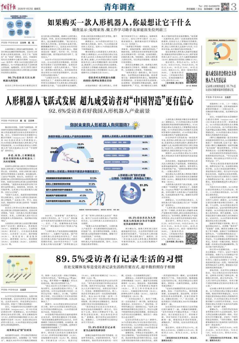 据中国青年报今日3版,从春晚舞台上略显生硬的扭秧歌,到进行拳击比赛时的惊艳亮相,2025年人形机器人迎来快速发展,实现了从“显眼包”到“团宠”的转变。近日,中国青年报社社会调查中心联合问卷网(wenjuan.com)发布的一项有1502名受访者参与的调查显示,90.7%的受访者关注了人形机器人的发展。处理家务、充当工作学习助手及家庭医生是受访者对人形机器人在家庭中应用的主要期待。